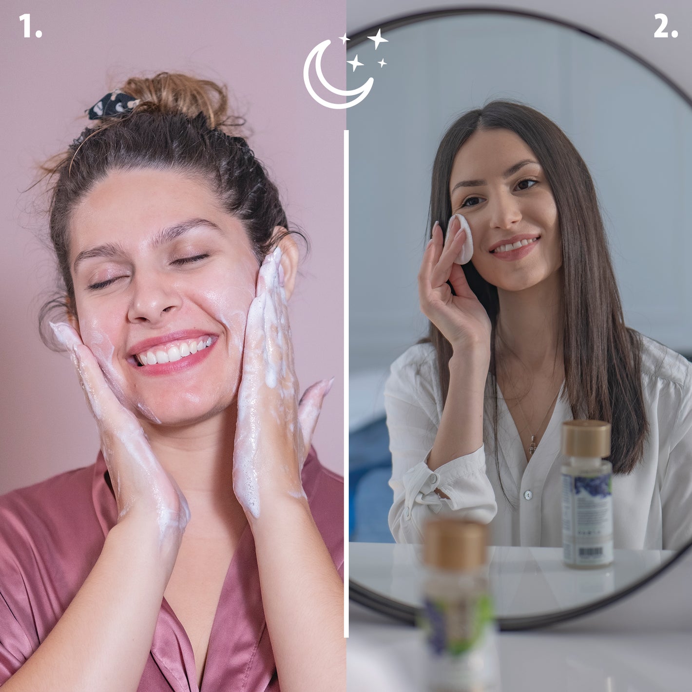 - Step 1: Start your day by washing your face with our Lavender & Blueberry Herbal Soap to eliminate impurities that the skin has shed overnight.
