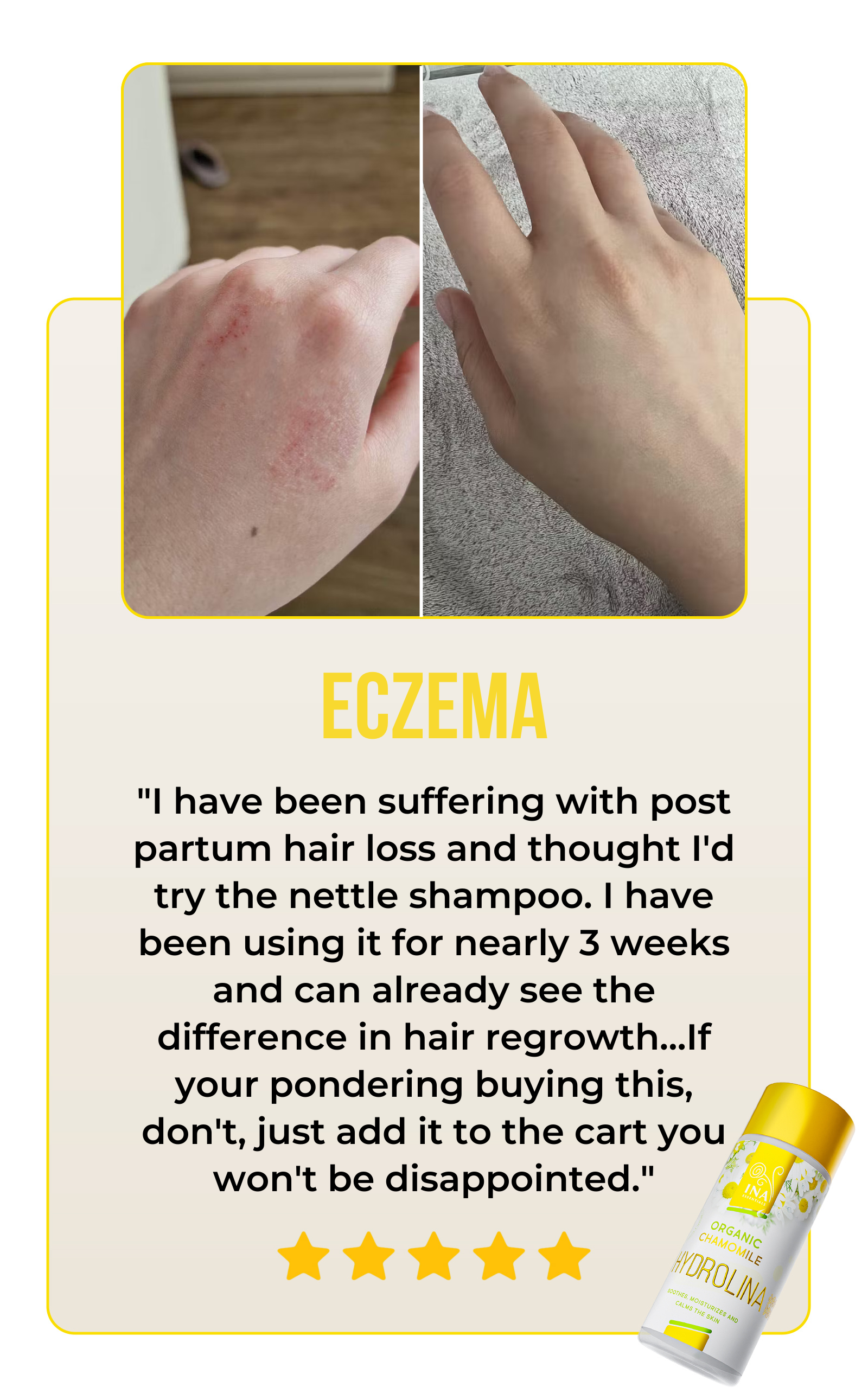 Organic Chamomile Hydrolina (150ml) is more than just a gorgeous bottle, it's fortified by real customer testimonials. With an impressive customer satisfaction score of over 90%, our product shows its effectiveness in soothing eczema, rashes, and skin irritations while enhancing your skin's health. Don't just take our word for it, read our customers' stories.