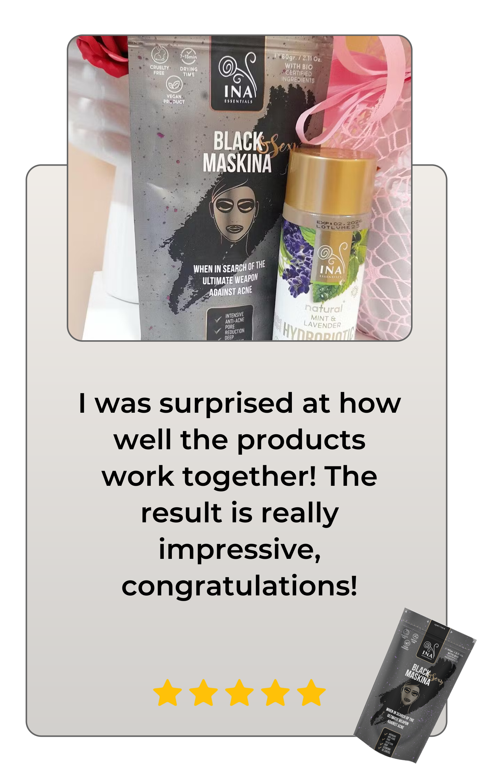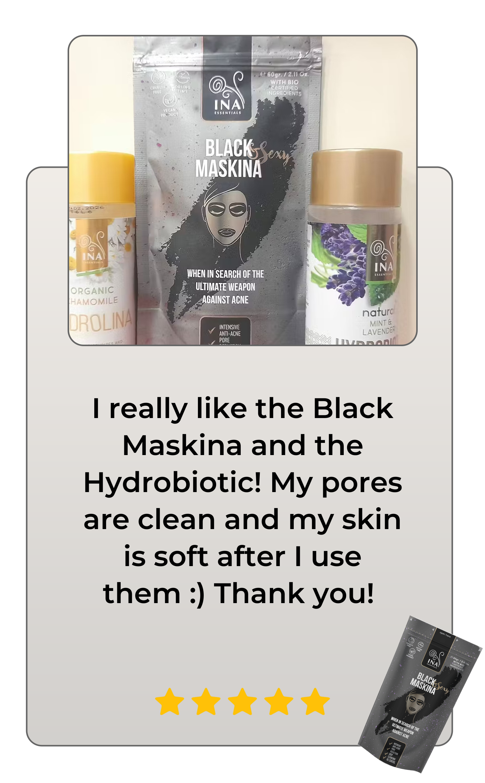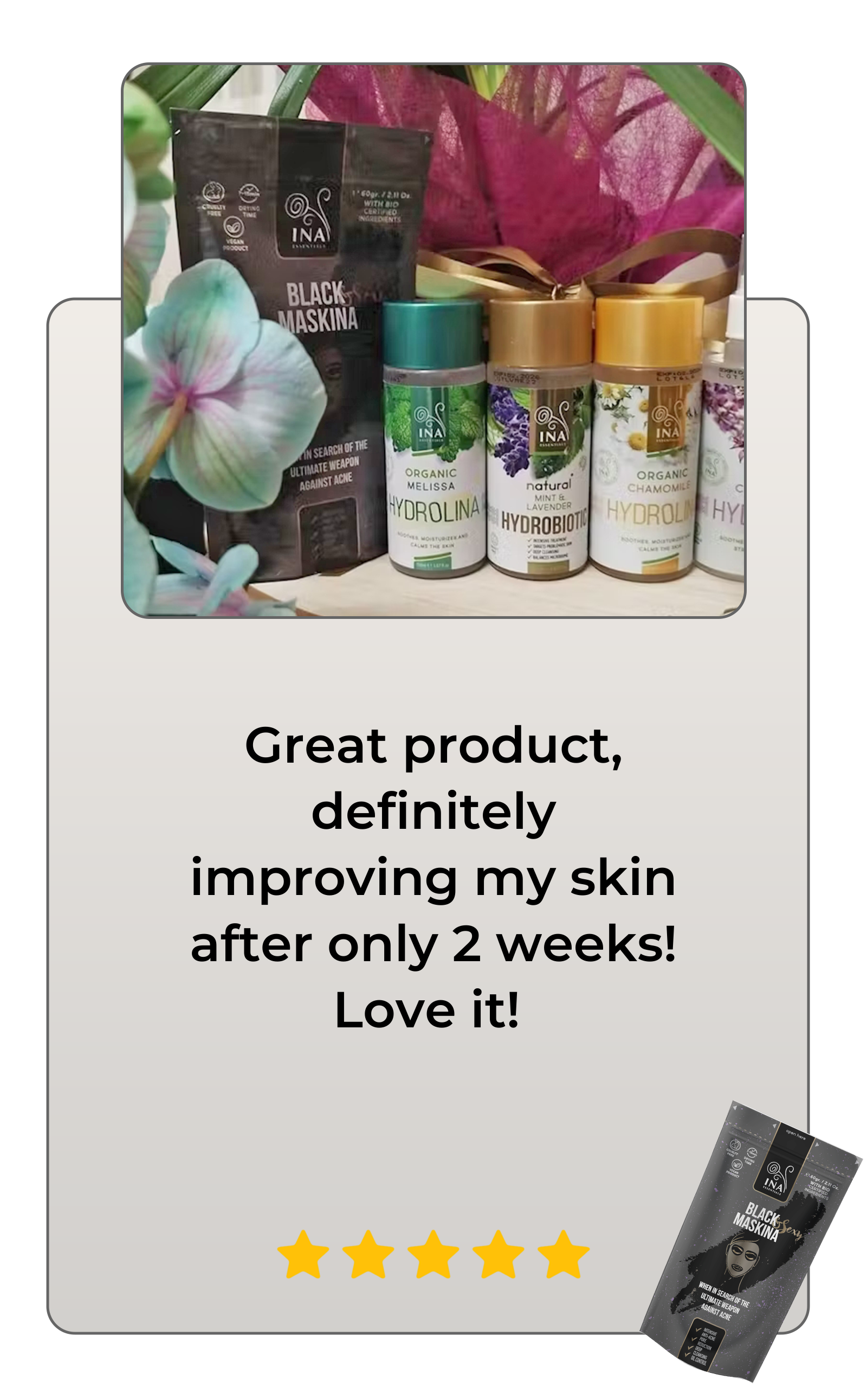 After less than a month of regular use the healing effects of the Black Maskina are fully felt. Acne signs are significantly reduced with the face free from blackheads and other impurities. The skin barrier is stronger and its natural ability to regulate oil production is regenerated leading to a beautiful and glowing look.