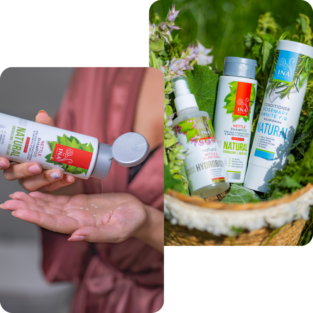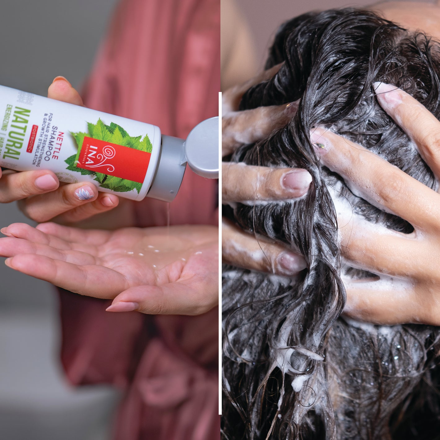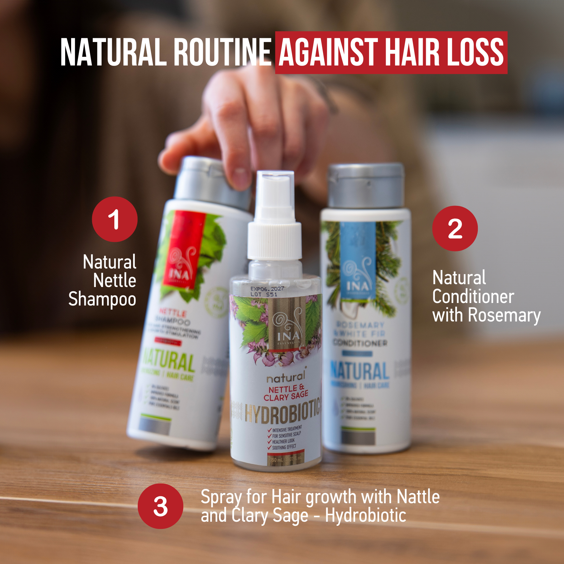 - Step 1: Wash your scalp with our new and improved Natural Nettle Hair Loss Shampoo enriched with Hyperferment postbiotic complex - fermented extracts of nettle, oak bark and licorice. This shampoo not only cleanses the impurities collected during the day, but also strengthens the hair, stimulates growth and reduces hair loss, while maintaining its natural hydration.