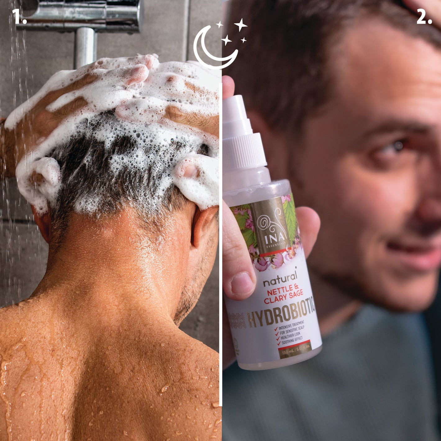 - Step 1: Wash your scalp with our new and improved Natural Nettle Hair Loss Shampoo enriched with Hyperferment postbiotic complex - fermented extracts of nettle, oak bark and licorice. This shampoo not only cleanses the impurities collected during the day, but also strengthens the hair, stimulates growth and reduces hair loss, while maintaining its natural hydration.
