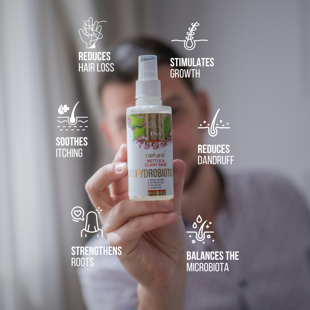 We have combined the best of nature. Wild Nettle Water - Hydrolina is designed to combat excessive oiliness and hair loss. Organic Sage Water - Hydrolina is designed to strengthen the scalp and fight dandruff and irritation. These properties are further enhanced by our Hyperferment complex - a combination of postbiotic cultures of oak bark, nettle and licorice. The product offers intensive care for the hair and scalp, ensuring that they remain healthy and nourished.