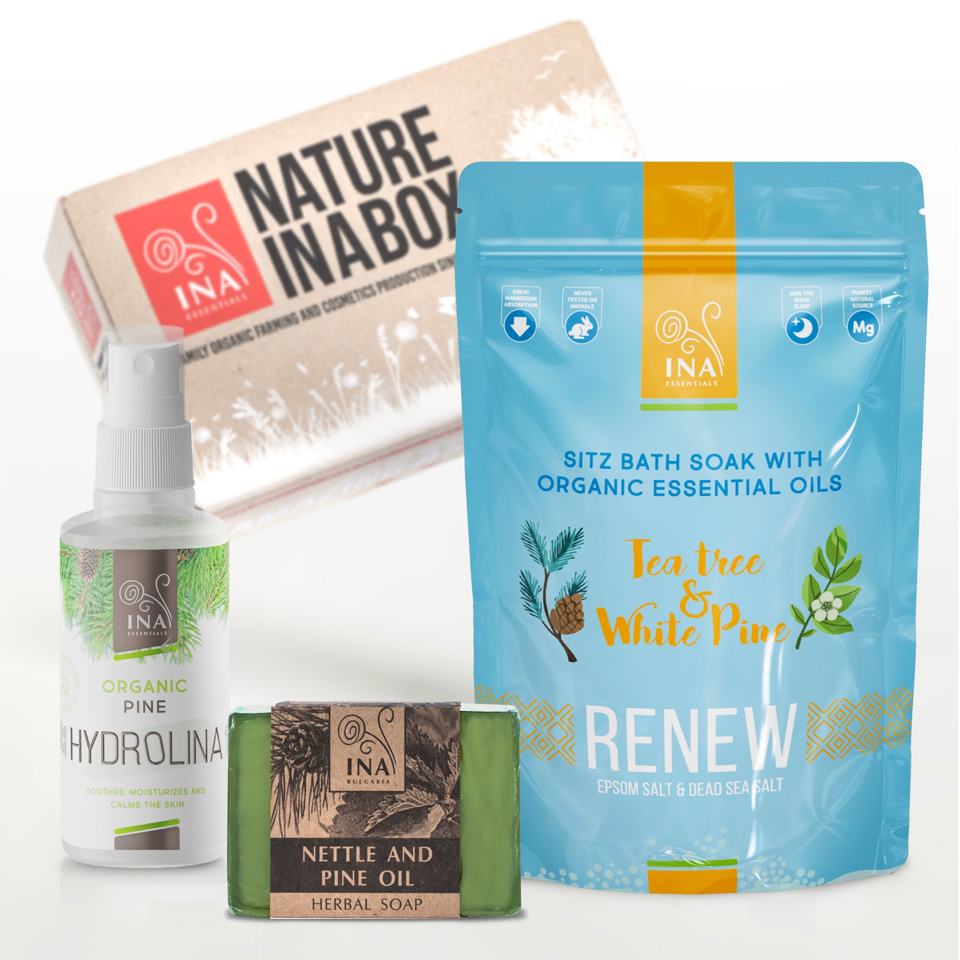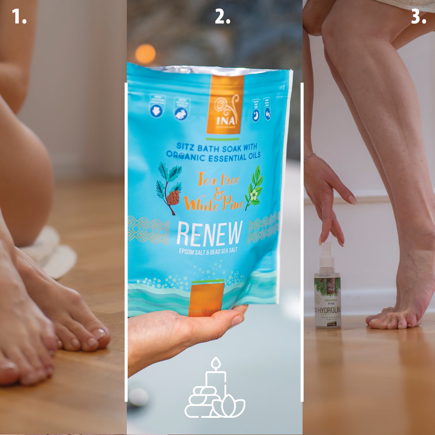 - Step 2: Then immerse your feet in the refreshing comfort of our Renew– Sitz bath salts with Tea Tree and White Pine. This step aids in the deep recovery and rejuvenation of your skin, while the potent salts and essential oils fight off fungal infections and soften the skin. The magnesium in the salts aids in boosting skin regeneration, promoting faster relief of any fungal-affected areas.