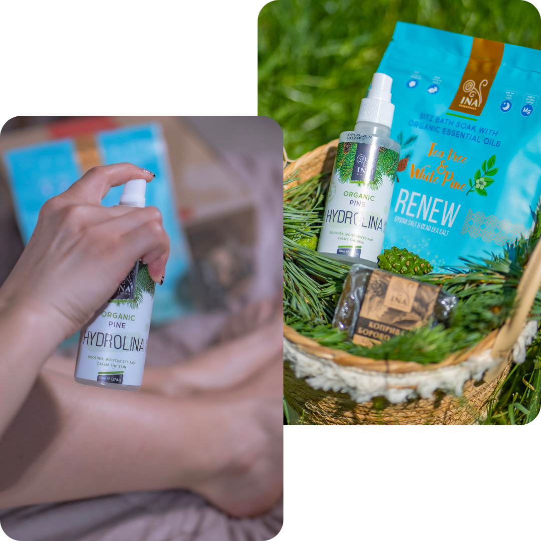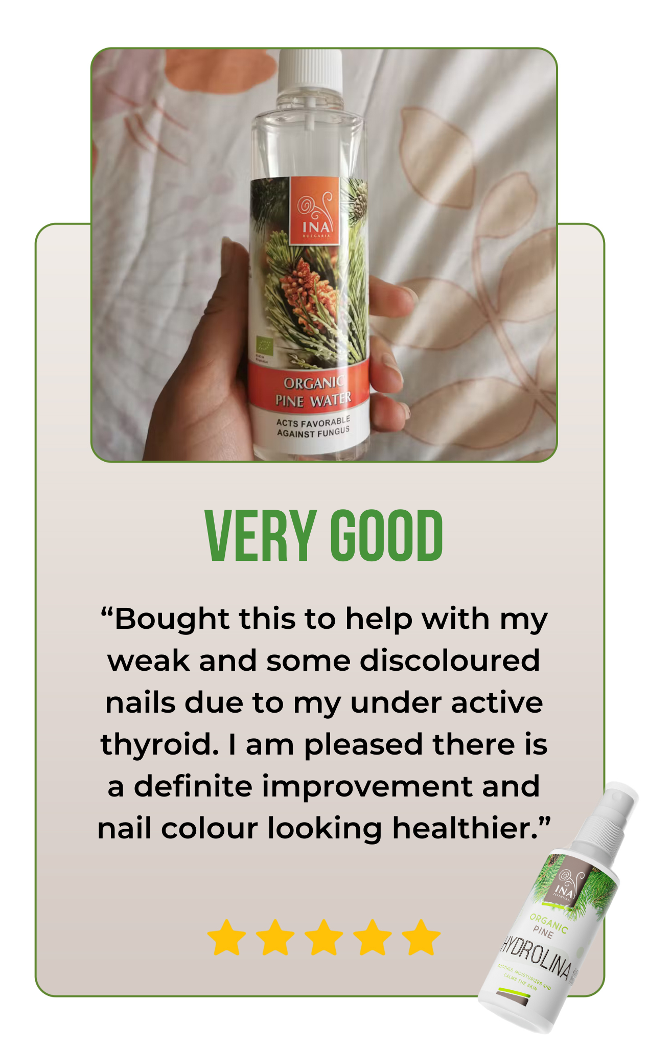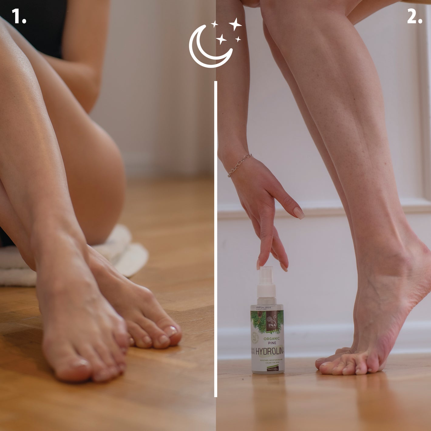 - Step 1: Spray our 100% Organic White Pine Water - Hydrolina. The anti-fungal properties of the Pine Water halt the growth of fungus, alleviate odour, and establish a protective shield against daily irritants. It is ideal for daytime application, particularly before slipping into shoes or heels that can cause your feet to sweat. It minimises the chances of foot chafing and offers a refreshing, cooling sensation.