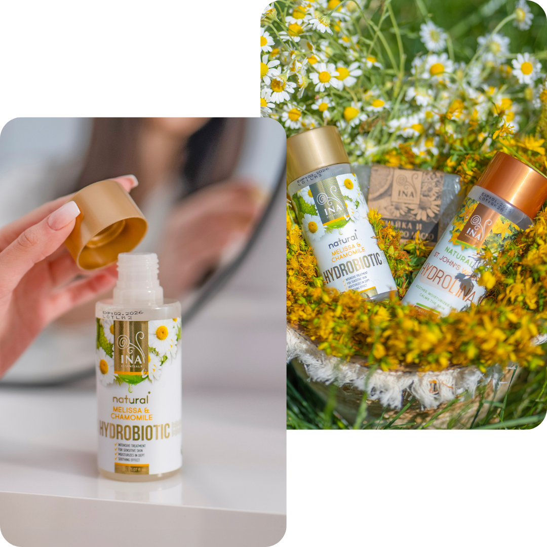 - Step 2: Afterwards, apply the Hydrobiotic - Chamomile, Melissa & Aloe Vera. This innovative formula is enriched with Aloe Vera postbiotic complex - fermented Aloe extract, specially developed for us in а high-tech laboratory in Bologna, Italy. The product works while you sleep, a time when your skin is naturally regenerating. The Aloe Vera postbiotic complex accelerates wound healing processes, strengthens your skin's natural barrier, and balances your skin's microbiota. It's like a night-time bodyguard, fighting against harmful microorganisms and nurturing your skin's health.